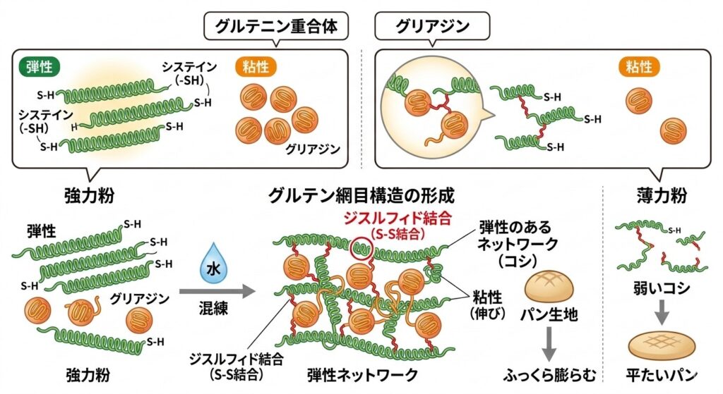 - 網目構造の完成: 引き伸ばされた「グルテニン」の長い鎖の隙間に、球状の「グリアジン」が入り込み、粘りと弾力を兼ね備えた立体的な「グルテン・マトリックス」が完成します。